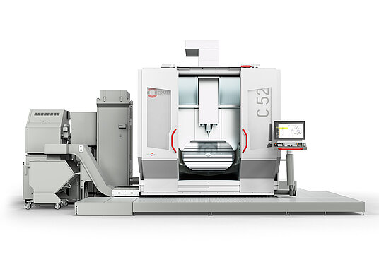 Mit der C 52 GEN2 können bis zu 2.000 kg schwere Werkstücke in 5-Achsen bearbeitet werden. Die optionale MT-Technologie eröffnet simultanes Drehen und Fräsen.