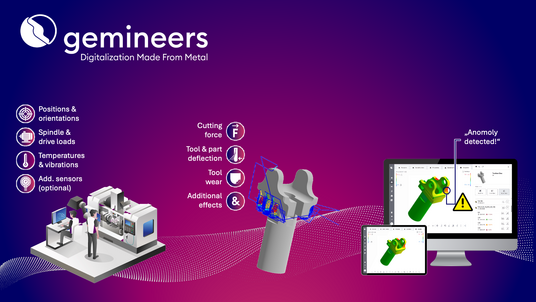 Lernen Sie die gemineers Digital Twin Plattform kennen. In Minutenschnelle auf Werkzeugmaschinen installiert, überwacht sie kontinuierlich Bearbeitungsprozesse in Echtzeit. Die gesammelten Daten werden automatisch zu einer präzisen virtuellen Replikation des Werkstücks verarbeitet. Diese Digitalen Zwillinge ermöglichen eine verbesserte Qualitätskontrolle, OEE-Berechnung, Optimierung der Werkzeugnutzung und vieles mehr.
